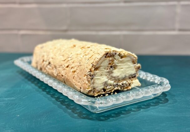 Merengue5 Eiwit260 gram KristalsuikerSnufje zout200 gram Ongezouten pecannoten1/2 blik Dulce de leche200 gram Gecondenseerde melk300 ml Slagroom1 Vanillepeul30 gram Ongezouten pecannoten, grof gehakt