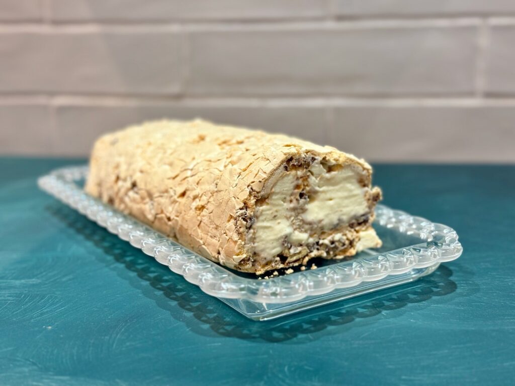 Als de merengue goed is afgekoeld verdeel over de onderkant hiervan de dulce de leche en de gehakte pecannoten. Verdeel hierover het slagroommengsel maar laat hierbij zo’n 2 cm van 1 van de korte kanten vrij. Rol de merengue voorzichtig op zodat de vulling er niet uit loopt. Leg de rol op een bakpapiertje op een snijplank of ovenplaat die geschikt is om in de vriezer te gaan. Laat het voor minimaal 2 uur in de vriezer liggen voordat je er plakken van snijdt.