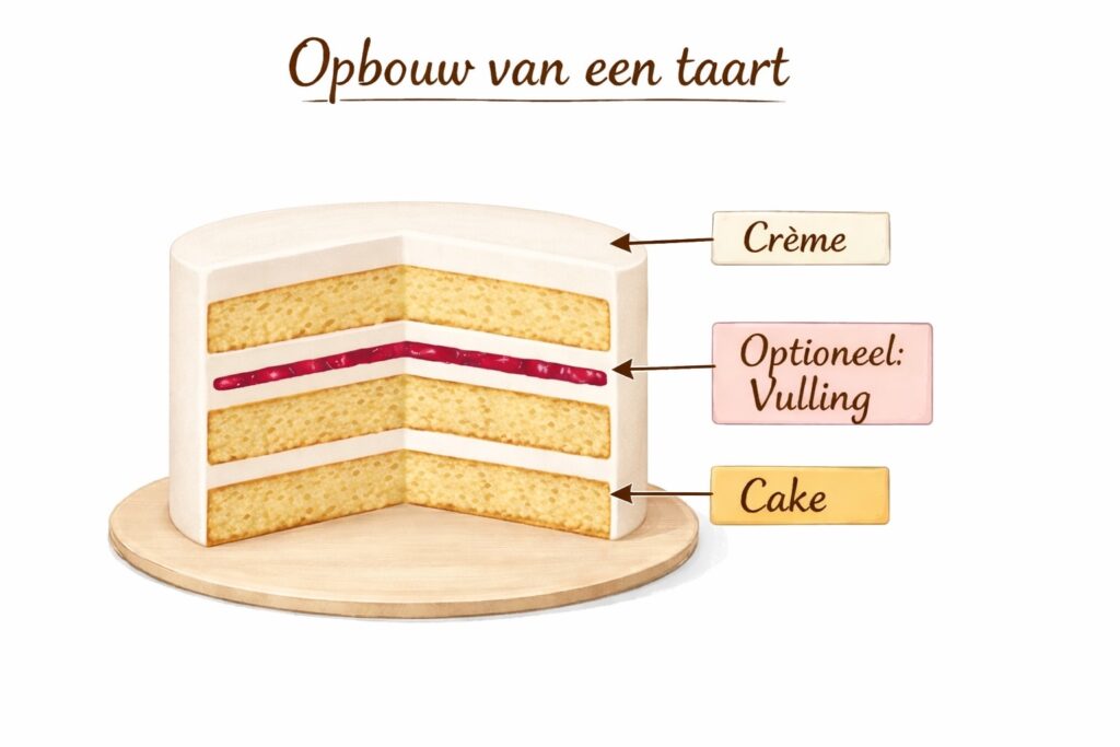 Een taart is opgebouwd uit lagen van cake of biscuit en een vulling. Wat je hierin wil kiezen is vaak erg persoonlijk. Ik werk in principe met een Swiss Merengue Buttercream, een luchtige en zachte botercrème die gemakkelijk op smaak te brengen is of te combineren is met andere soorten vullingen.